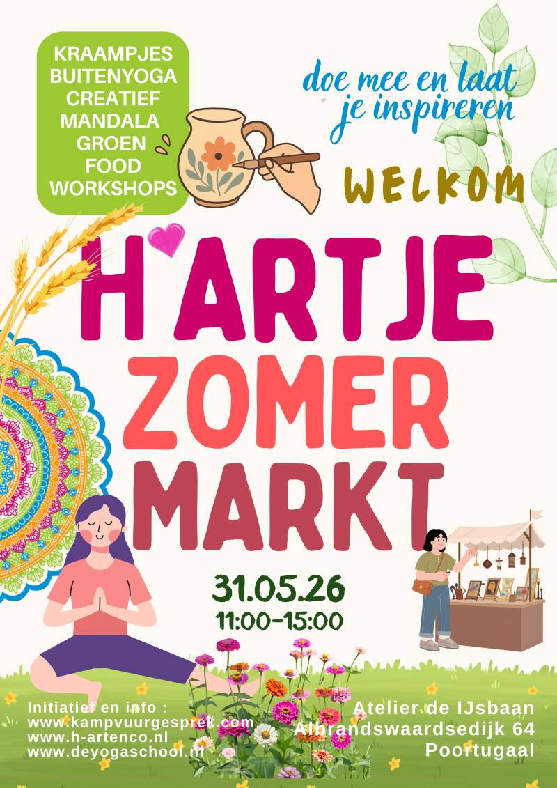 H'Artje Zomer Markt bij de IJSBAAN. Je kunt ( gratis ) meedoen met de yoga of een creatieve workshop. Verder zijn er wat kraampjes en staat de thee en koffie met iets lekkers klaar. Gewoon samen doen en gezellig samen zijn. Dus schrijf deze datum in je agenda.