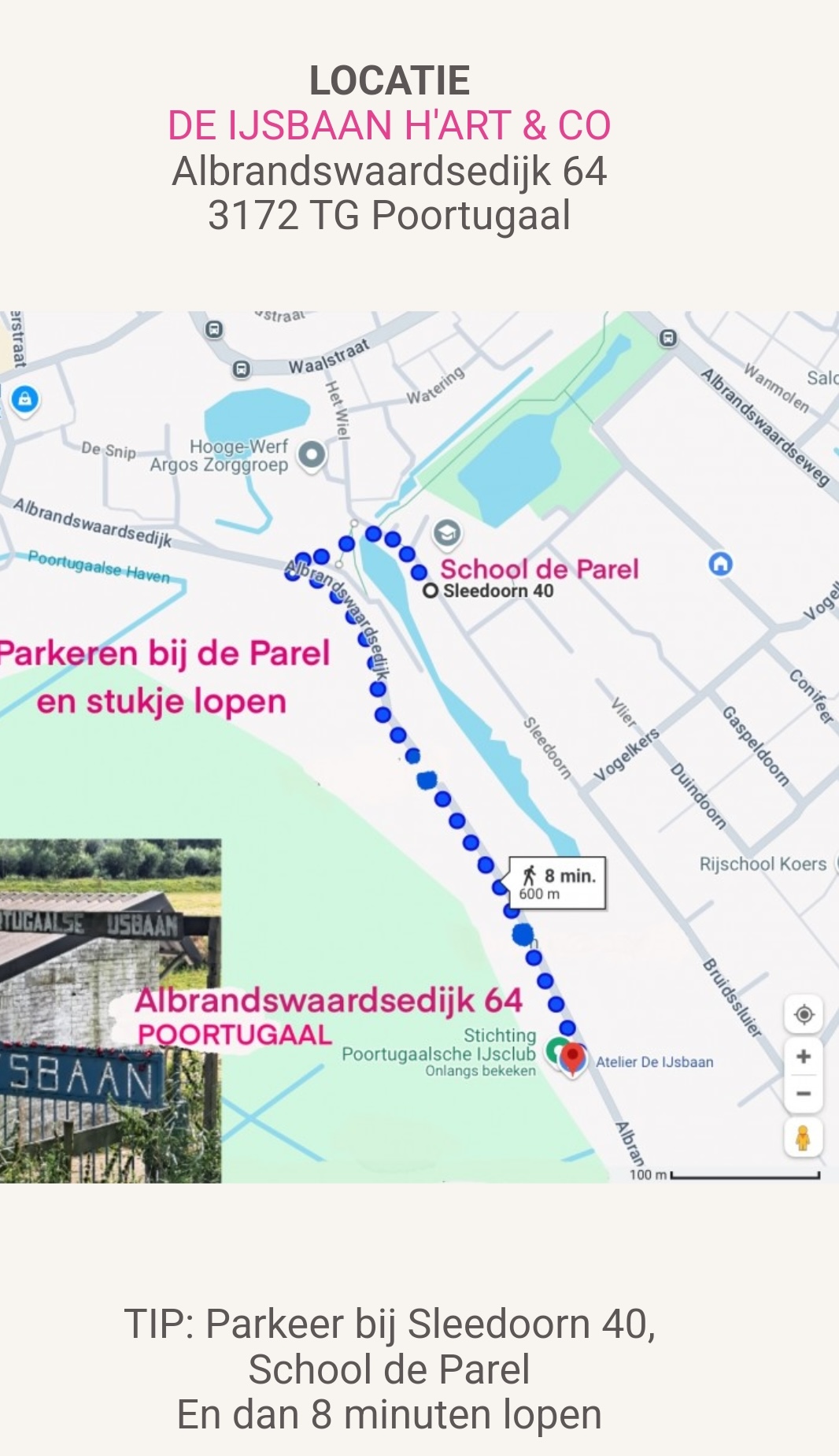 Parkeren lukt niet altijd voor de deur. Parkeer daarom bij de school de Parel, Sleedoorn 40, Poortugaal ( klik hier voor afbeelding)!